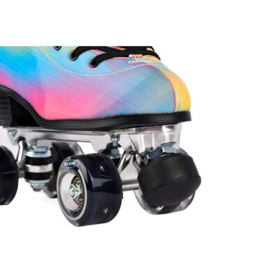 Meet the Micro Twilight Quad Skate – a true spectacle of uniqueness and modern aesthetics. Prepare to be entranced by its distinctive appearance, as the entire skate is embellished with a mesmerizing holographic fabric that reflects a myriad of colors, transforming each stride into a dazzling display.